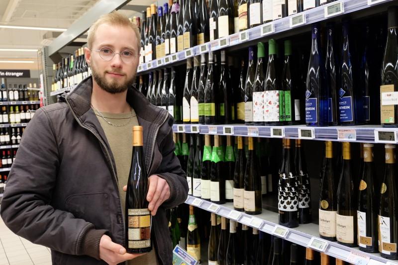 Entre Noël et jour de l’an, c’est une fin d’après-midi tranquille à l’hypermarché de l’enseigne U à Gertwiller. Le rayon vins s’étale sur cinq travées, chargées recto verso sur cinq étages. Trois s’interrompent pour faire de la place à une présentation en casier, en caisse ou en cartons de six. Cet espace n’est pas spécialement pris d’assaut, mais il y a toujours quelqu’un pour circuler dans les allées. La plupart des acheteurs du moment se définissent comme des consommateurs irréguliers.