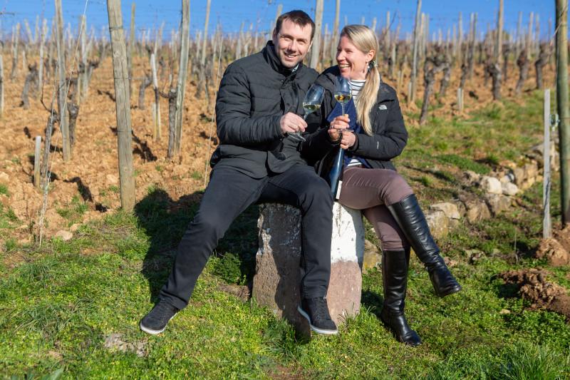 Chacun ses vignes, chacun son domaine, un seul amour. Vingt-six ans après leur première rencontre dans les couloirs du lycée viticole de Mâcon, dix ans après s’être passé la bague au doigt et sept ans après la naissance de leur fille Clotilde, Agathe Bursin et Mickael Moltès sont toujours aussi complémentaires… et amoureux. Elle, ce sont six hectares de vigne travaillés, récoltés et vinifiés avec passion au cœur de Westhalten depuis 2001.