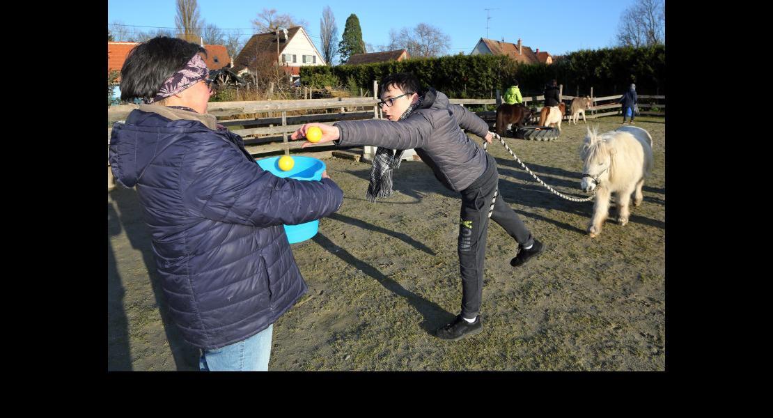 « Ramenez une balle bleue », commande Stéphanie De Sousa. Laurena, Marie, Alexandre, Félicien, Mathis et Sacha, s’activent. Les six adolescents de 15 à 20 ans fréquentent le service d’accueil des jeunes autistes (Saja) de l’IMPro du Ried (Institut médico-professionnel), à Huttenheim. Depuis deux ans et demi, ils viennent une fois par semaine, pour une séance d’une heure à La Ferme du pays d’eaux, à Ehnwihr (Muttersholtz).
