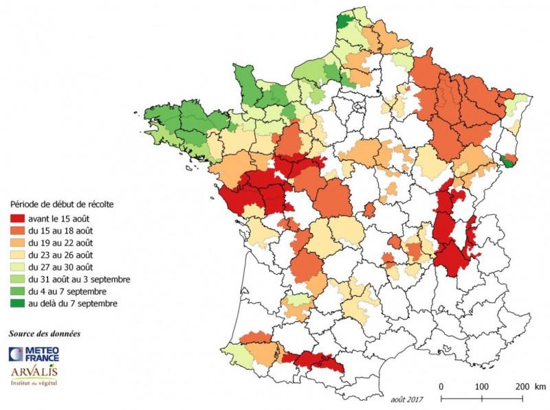 Établie le 7 août, la carte publiée par Arvalis précise, par région, la période probable de début des chantiers de récolte pour des scénarios climatiques à venir chauds. L’objectif est de sensibiliser les éleveurs, Cuma et entreprises de travaux agricoles à l’avancement de la maturité des maïs pour déclencher les chantiers de récolte à temps.