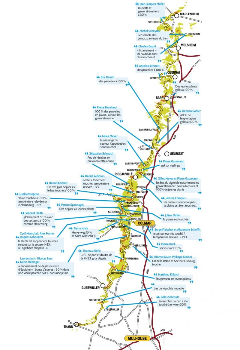 Il faut attendre de voir si ça va repartir, voir si les contre-bourgeons vont redémarrer, disent les techniciens du vignoble. Certaines stations météo ont affiché jusqu’à - 6 °C et - 7 °C, plutôt dans des zones de plaine. Il semble qu’aux embouchures des vallées, Noble à Soultzmatt, vallée verte à Turckheim, vallée de Kaysersberg à Sigolsheim, Val de Villé à Scherwiller-Chatenois, les dégâts sont considérables, ainsi que globalement en plaine, et particulièrement le long des axes de transport routiers et ferroviaires.
