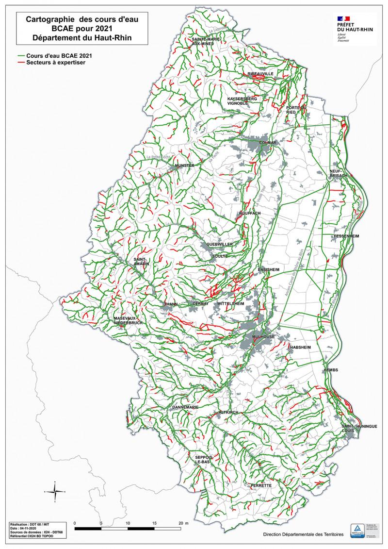 Parallèlement au travail de l’IGN, la DDT du Haut-Rhin, en partenariat avec la profession agricole, les collectivités, Alsace Nature et l’office français de la biodiversité (OFB, ex-ONEMA), réalise une carte locale des écoulements d’eau, basée sur des visites de terrain et qui devrait être finalisée en 2021. Elle permettra dès 2022 de passer à une carte locale BCAE, plus précise que les données IGN. Cette carte locale des écoulements d’eau étant déjà bien avancée, elle a permis d’identifier sur la nouvelle carte dématérialisée BCAE certains secteurs à expertiser où la nature de l’écoulement reste à confirmer.