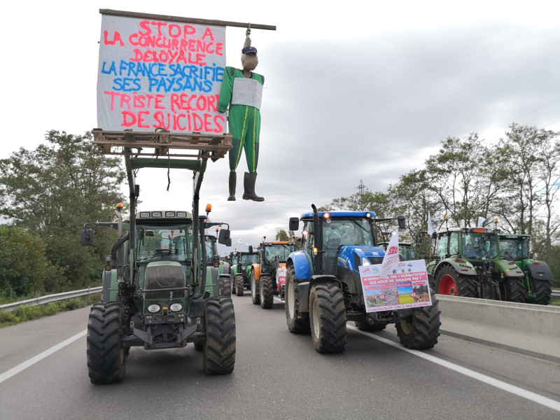 « What is going on ? » Coincé dans sa berline noire au niveau de l’échangeur A35-A36, un couple de Hollandais s’interroge sur le spectacle qui se dresse devant eux. Venus de tout le Haut-Rhin, près de 200 tracteurs ont élu domicile pendant trois heures sur les deux autoroutes situées aux abords de Mulhouse. Comme leurs homologues bas-rhinois, les agriculteurs haut-rhinois ont répondu à l’appel national lancé par la FNSEA et les JA pour dire « stop » à l’agribashing, aux surtranspositions franco-françaises en matière de réglementation et aux accords de libre-échange Ceta et Mercosur. Le spectacle est impressionnant. Sur la bretelle qui mène à Colmar, un coup d’œil en contrebas donne l’impression d’un paysage suspendu dans le temps. Les deux rangées de voitures sont à l’arrêt total. Le calme qui règne est troublant pour un lieu de passage comme celui-là. La situation est à la fois inédite, agaçante, interminable et désespérée. « Au-delà des raisons économiques, ce sont surtout des raisons psychologiques et morales qui nous poussent à agir aujourd’hui. À écouter les médias ou nos concitoyens, nous sommes responsables de tous les maux. Aujourd’hui, nous nous sentons véritablement mal aimés par la population qui nous entoure », se désole le président de la FDSEA du Haut-Rhin, Pascal Wittmann. Compréhension, résignation et agacement « France, veux-tu encore de tes paysans ? », « France, protège tes paysans », « Que mangeras-tu quand nous aurons disparu ? ». Des slogans évocateurs sont placés à la vue des automobilistes qui attendent, patiemment, que la situation se décante. Beaucoup ne comprennent pas ce qui se passe ici. Josine revient d’Allemagne où elle vit une partie de l’année. Cette jeune retraitée hollandaise estime que la situation vécue par les agriculteurs d’aujourd’hui est juste « honteuse ». « Il faut toujours produire plus à des prix toujours plus bas. Je les comprends. À titre personnel, j’achète tous mes produits en magasin bio, et de préférence local. Cela a, à mes yeux, bien plus de sens que d’abattre un animal en France, le transformer en Italie et le conditionner en Pologne. Tout cela est profondément stupide ! » Mais Josine s’étonne tout de même du déroulé de la manifestation : « Pourquoi personne ne vient me parler ? Il faudrait un petit papier avec leurs revendications. Je ne demande que ça de comprendre un peu mieux ce qu’il se passe. » Un peu plus loin dans le long cortège de voitures immobilisées, un homme perd patience. D’un pas décidé, les bras croisés, il se dirige vers le gendarme motorisé chargé de réguler le filtrage des véhicules. Sur cette bretelle de l’A35, cela fait près de quinze minutes que les voitures font du sur place. Pour certains, c’est une éternité. La vitre ouverte, le moteur éteint, un couple de quadras dynamiques semble désabusé. « C’est bien sympa tout ça, mais ils nous font perdre des rendez-vous business importants… » Eux non plus ne savent pas concrètement ce qui se passe. Juste des tracteurs qui bloquent la route et leur compteur temps qui défile. Après quelques explications, ils arrivent à relativiser la situation. D’ailleurs, la circulation s’apprête à repartir. Le chauffeur polonais qui les précède est soulagé, avec le sourire du moins. Si quelques coups de klaxons se font entendre parmi les plus impatients, la plupart des automobilistes rencontrés disent « comprendre » le ras-le-bol exprimé par les agriculteurs. « Mais sur la forme, je ne peux pas dire que je soutiens, relativise Julien, au retour d’un rendez-vous professionnel en Allemagne. Je sais que c’est dur pour eux, et que l’action est justifiée. C’est juste dommage que ça soit nous qui subissions cela. J’espère tout de même que cette action leur permettra d’améliorer leur situation. » Geneviève est plus compatissante. Cette retraitée mulhousienne est passée au « tout local » il y a un an. « Il faut les comprendre. Qui accepterait de travailler dans ces conditions avec, au final, si peu de reconnaissance ? Même si je suis bloquée, ce n’est pas grave. Il faut qu’ils puissent s’exprimer. » Reconquérir « l’amour » des gens Thierry Grosheny, exploitant agricole à Flaxlanden se dit lassé de cette situation. Ce n’est que la deuxième fois de sa carrière professionnelle qu’il manifeste. « Je suis là pour témoigner de mon ras-le-bol qui est surtout médiatique. On nous fait passer pour des pollueurs. On nous crache dessus du matin au soir. On nous interpelle quand nous travaillons dans nos champs. Alors que, dans le même temps, on tente de faire notre métier le mieux possible. On parle partout de nous, de nos pratiques, de notre métier. Or, rares sont les gens qui nous connaissent vraiment. Pour ma part, je suis fier de ce que je fais. Mais, ces minorités agissantes relayées par les médias, il y en a vraiment marre ! », s’agace l’agriculteur. À ses côtés, on retrouve des professionnels déjà expérimentés comme Paul Deguille de Galfingue et Laurent Rimelin de Heimsbrunn. Il y a également la nouvelle génération. « C’est ma première manif ! Je me suis installé sur l’exploitation familiale à Habsheim il y a trois ans. Je suis désormais associé avec mes parents. Je suis venu car il faut être présent. Que l’on ne fasse rien ou que l’on fasse quelque chose, de toute façon on sera critiqué. Alors, autant agir. », conclut Jean-Philippe, âgé de 23 ans. « Oui, c’est un cri de détresse que nous lançons aujourd’hui », indique Pascal Wittmann. Avec plus de 400 suicides par an, des revenus qui continuent leur lente érosion, l’absence de perspectives pour les plus jeunes et la remise en cause même de l’activité de l’agriculteur, la profession a l’amère sensation d’être devenue la paria d’une société qui semble perdre tout bon sens et 
